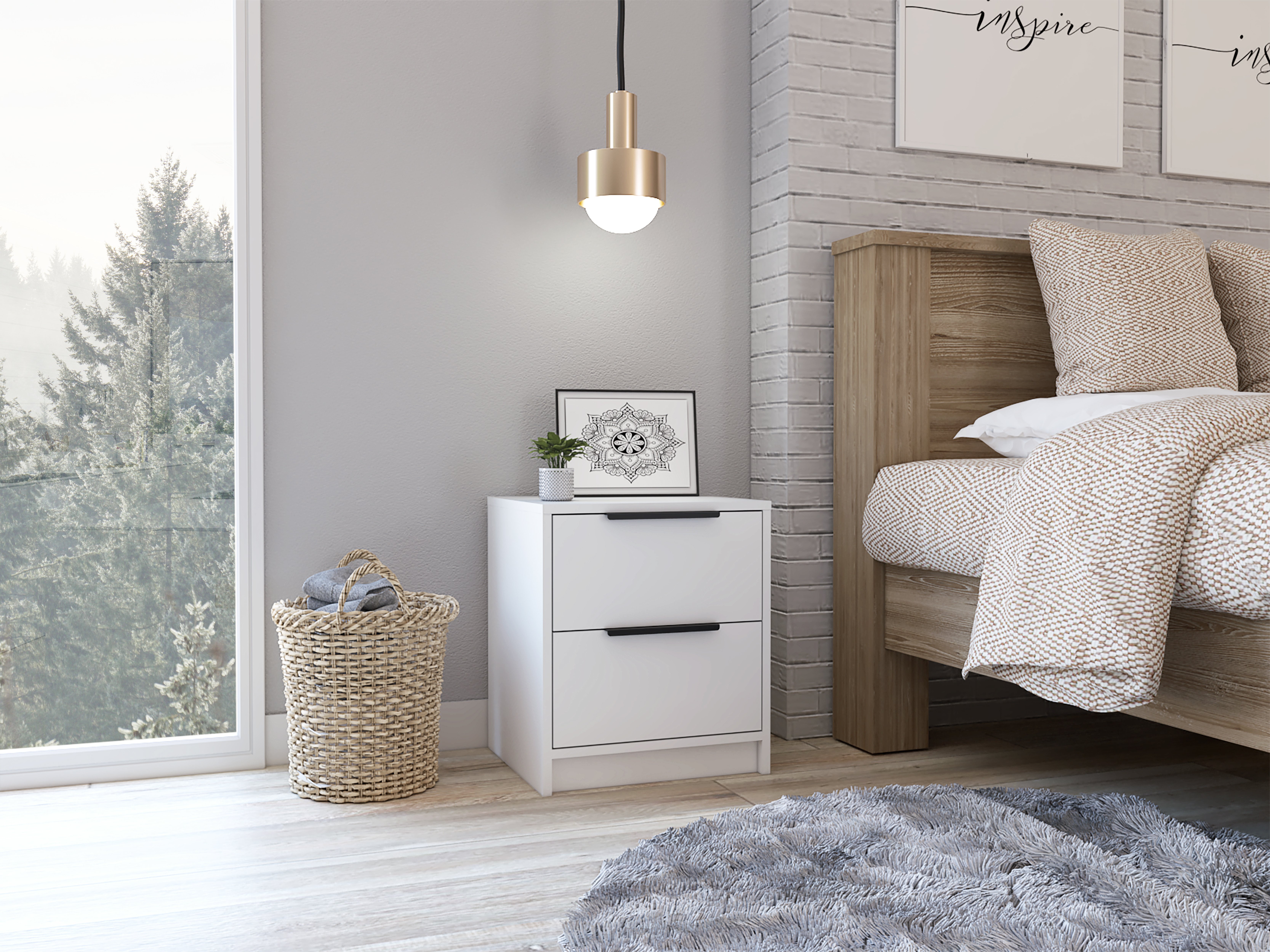 Romance CopyClean and compact, this contemporary two-drawer nightstand is the perfect upgrade for your bedroom. In a stylish finish, it boasts ample storage and a cool look accentuated with long, slender bar drawer handles. The two drawers are great options for that extra storage space you want next to your bed.Product DetailsSet includesOne (1) nightstandDimensions18.8 inches high x 16.1 inches wide x 14.2 inches deepFinish ColorWhiteMaterialsManufactured woodNumber of drawers2