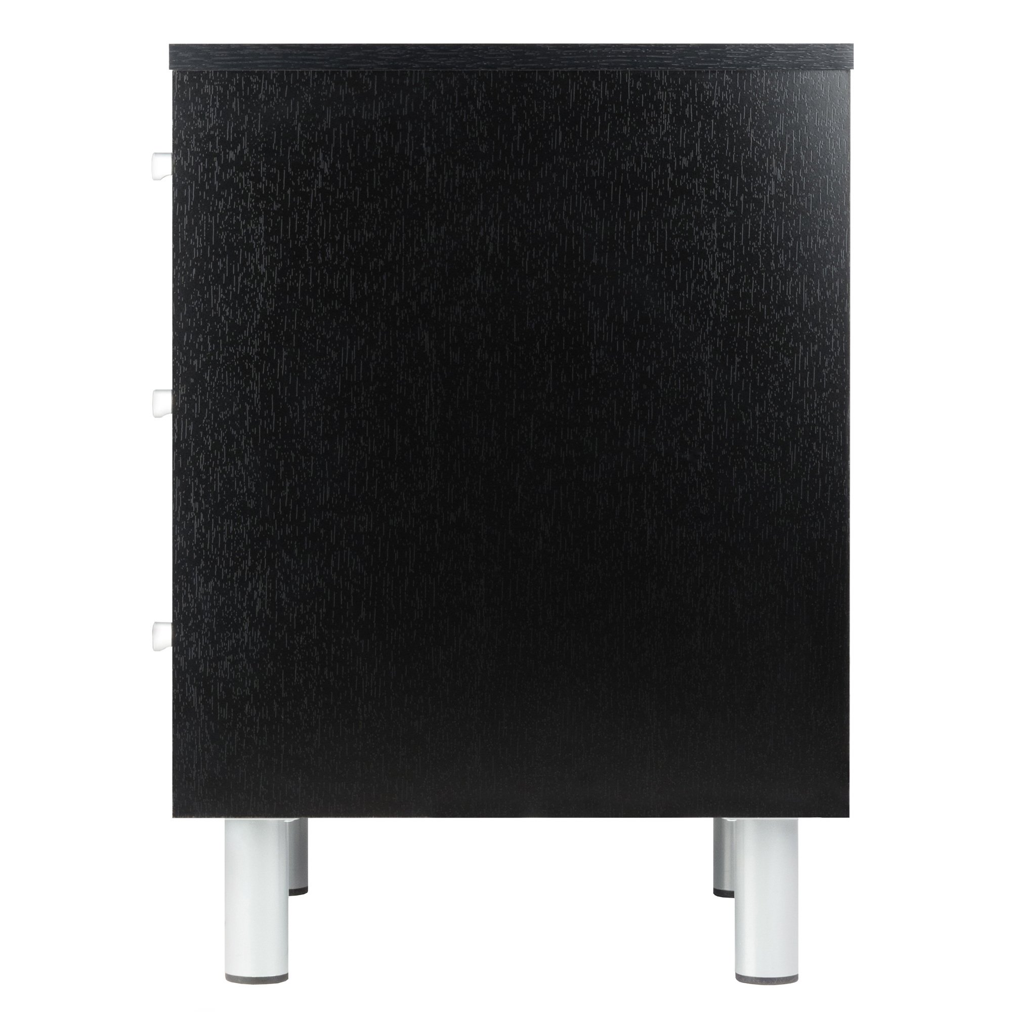 Perfect table for your night time essentials with three drawers and is also a stylish addition for your bedroom. Black with metal accent. Overall table size 15.75"W x 16.1"D x 22"H. Top dimension is 15.75"W x 15.75"D and inside drawer is 12.75"W x 13.6"D x 4.3"H. Floor clearance is 4". Black veneer on composite wood. Assembly required.Overall table size 15.75"W x 16.1"D x 22"H. Table top is 15.75"W x 15.75"D.Table comes with 3 Drawers with inside storage dimension of 12.75"W x 13.6"D x 4.3"H.Door clearance is 4". Black veneer on composite wood. Assembly required.nullnullnull